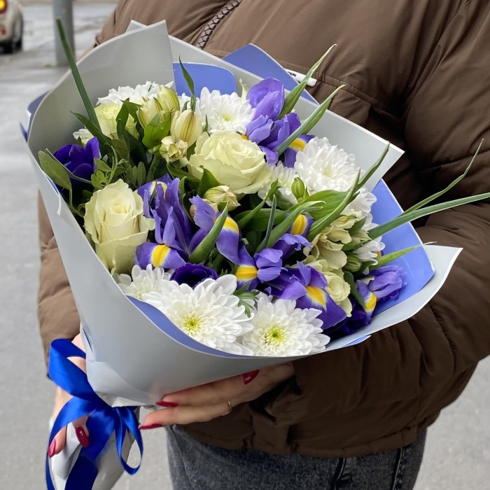Букет из яркого ириса с белыми розами и хризантемой. Дарите свою любовь, внимание и заботу, а наши флористы Вам в этом помогут.