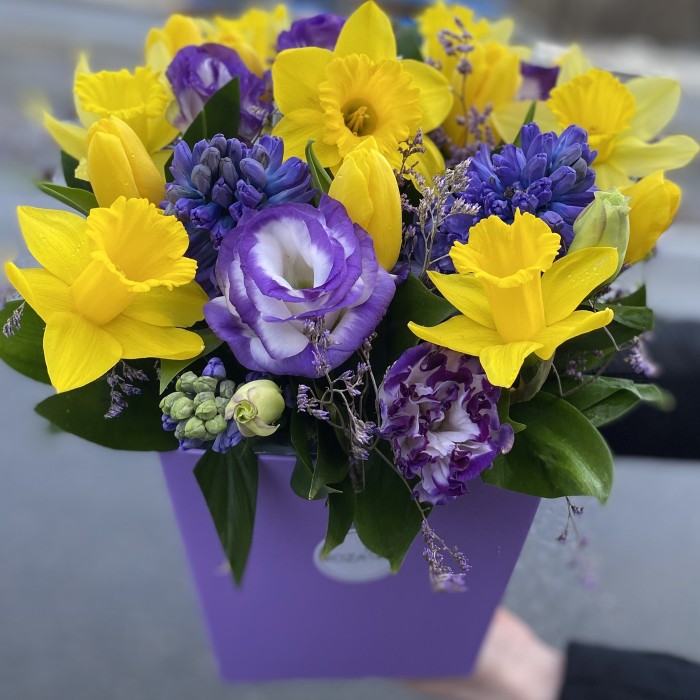 Яркая весенняя композиция поднимет настроение и порадует своим чудесным ароматом. В составе, весенние нарциссы и гиацинты, они излучают тонкий сладкий аромат.
