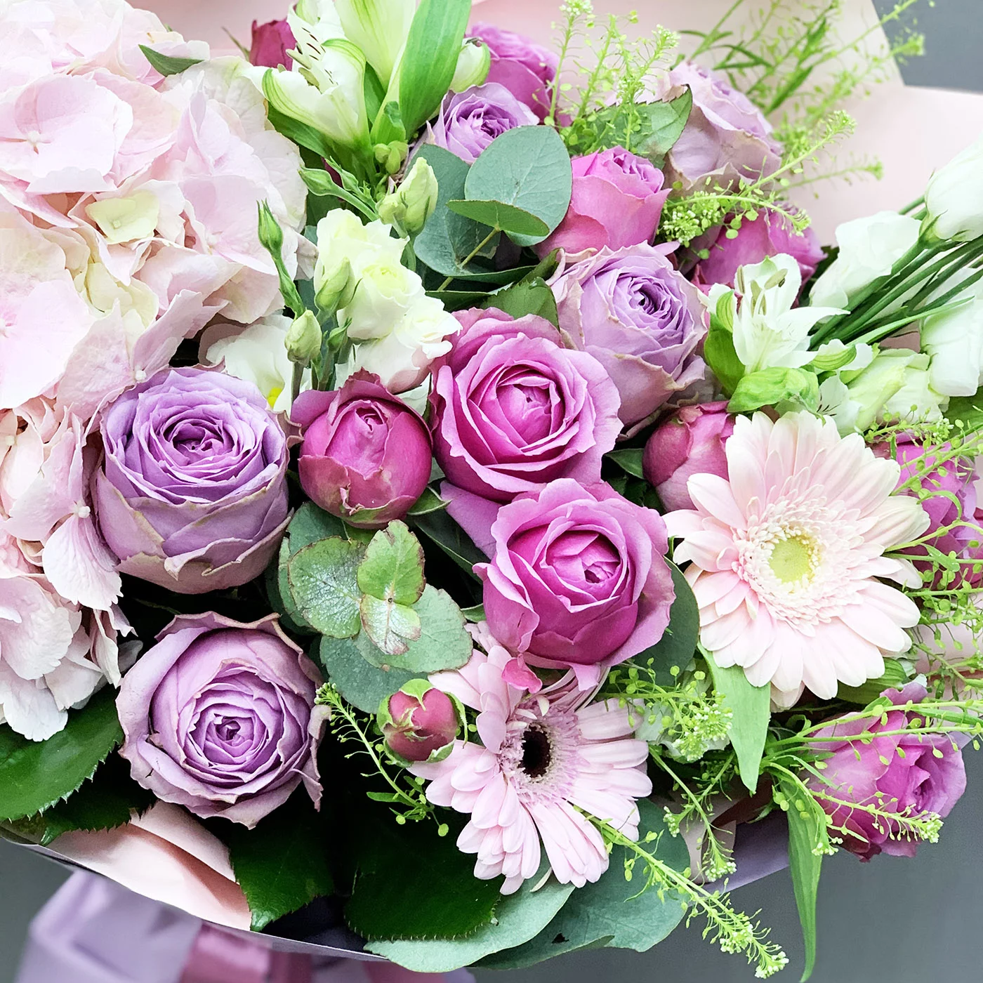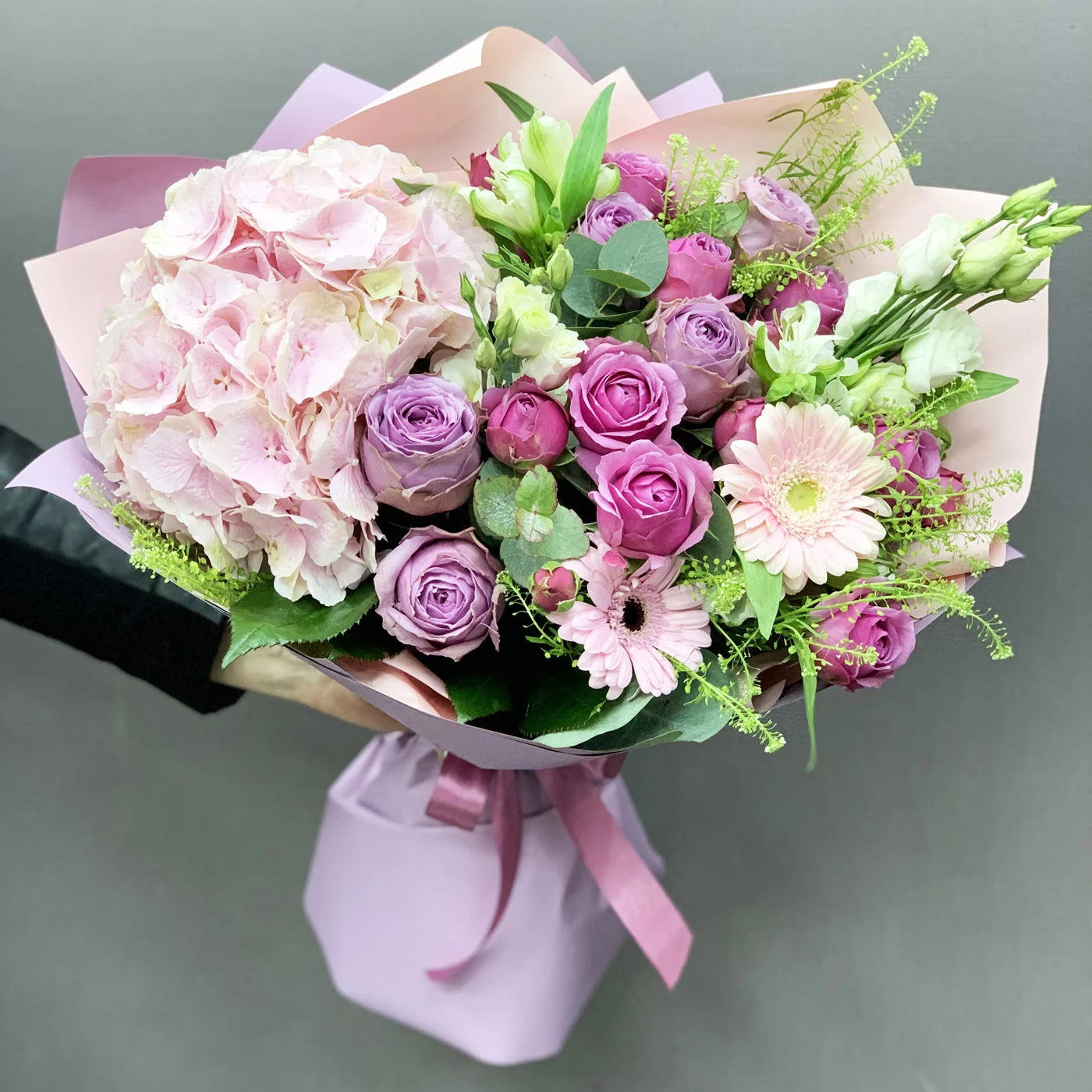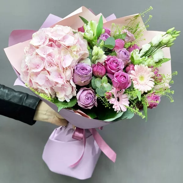 Состав букета: гортензия розовая - 1 шт, гермини розовая - 2 шт, альстромерия белая - 2 шт, кустовая пионовидная роза Мисти Баблз - 4 шт, роза Найтингеил - 5 шт, гринбел - 1 шт, эустома белая - 1 шт, эвкалипт - 2 шт, рускус, упаковка