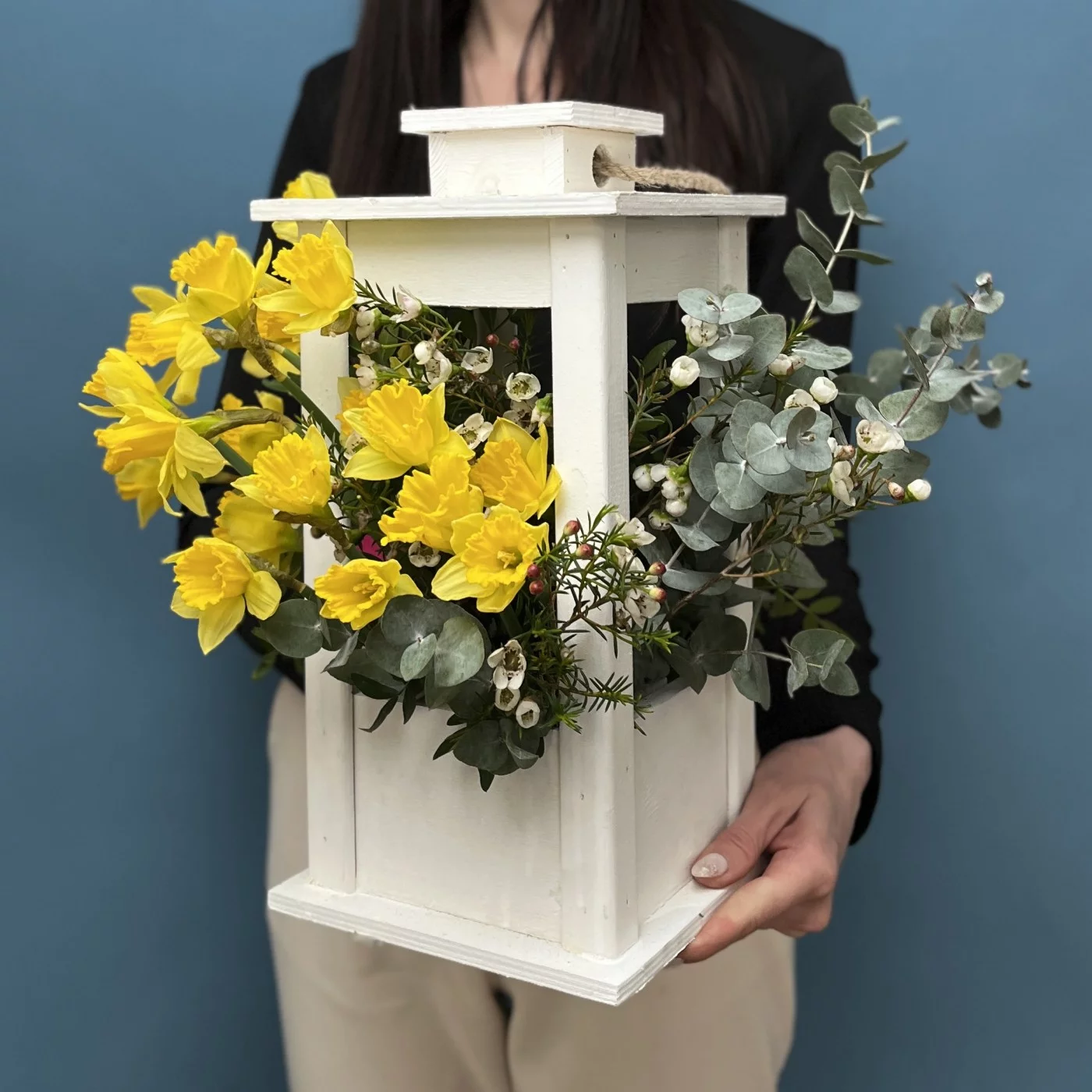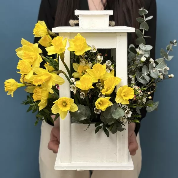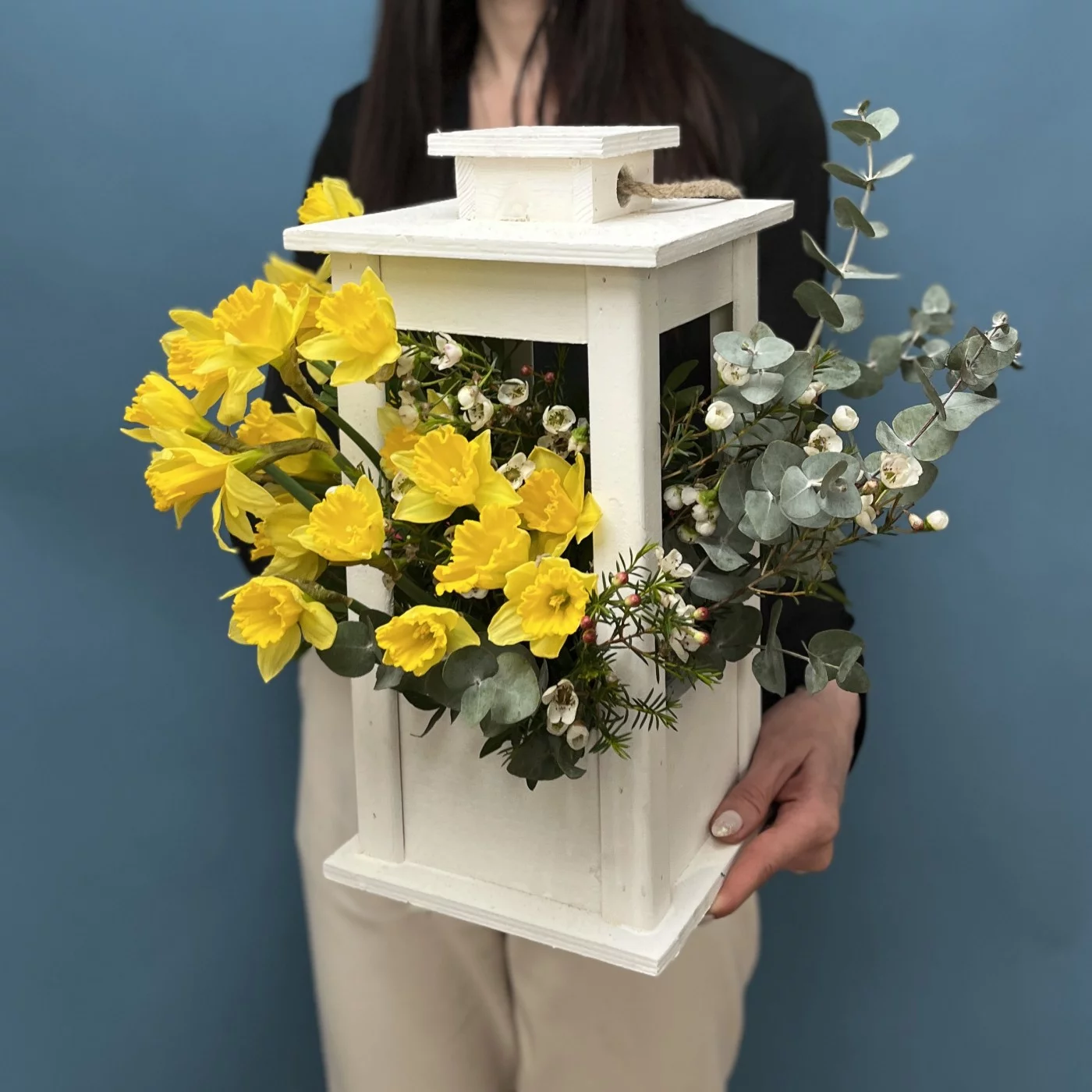 Весенняя композиция в фонаре с нарциссами — это оригинальное и стильное цветочное оформление, которое добавит яркие акценты и весеннее настроение в любой интерьер.