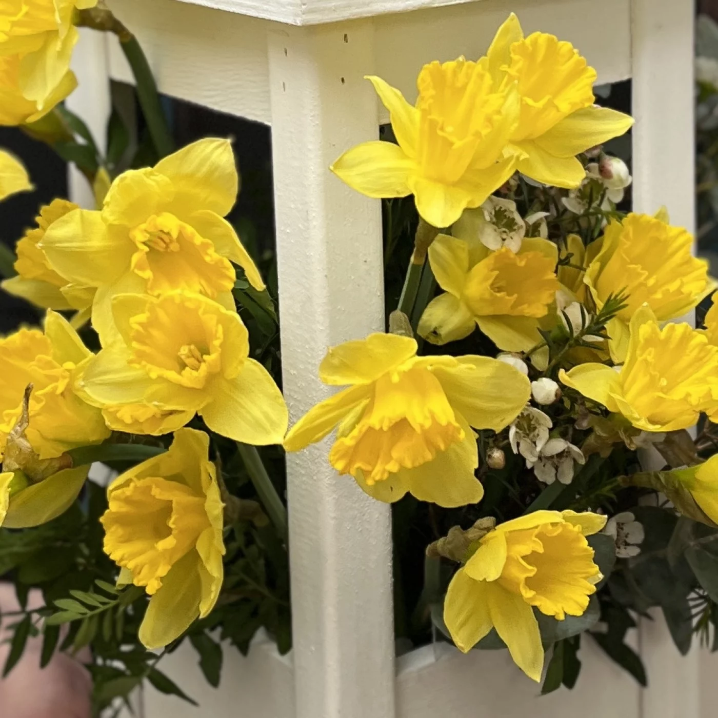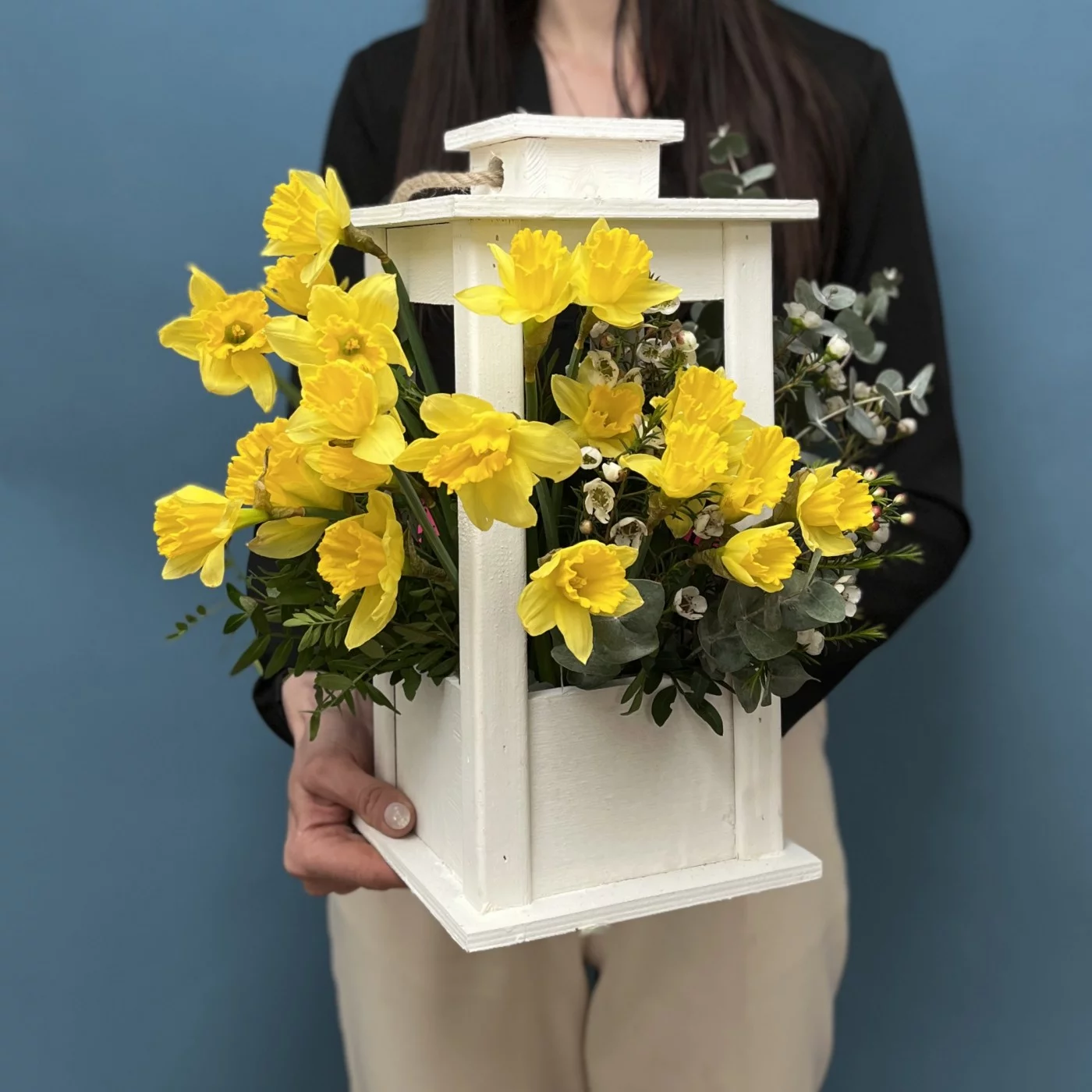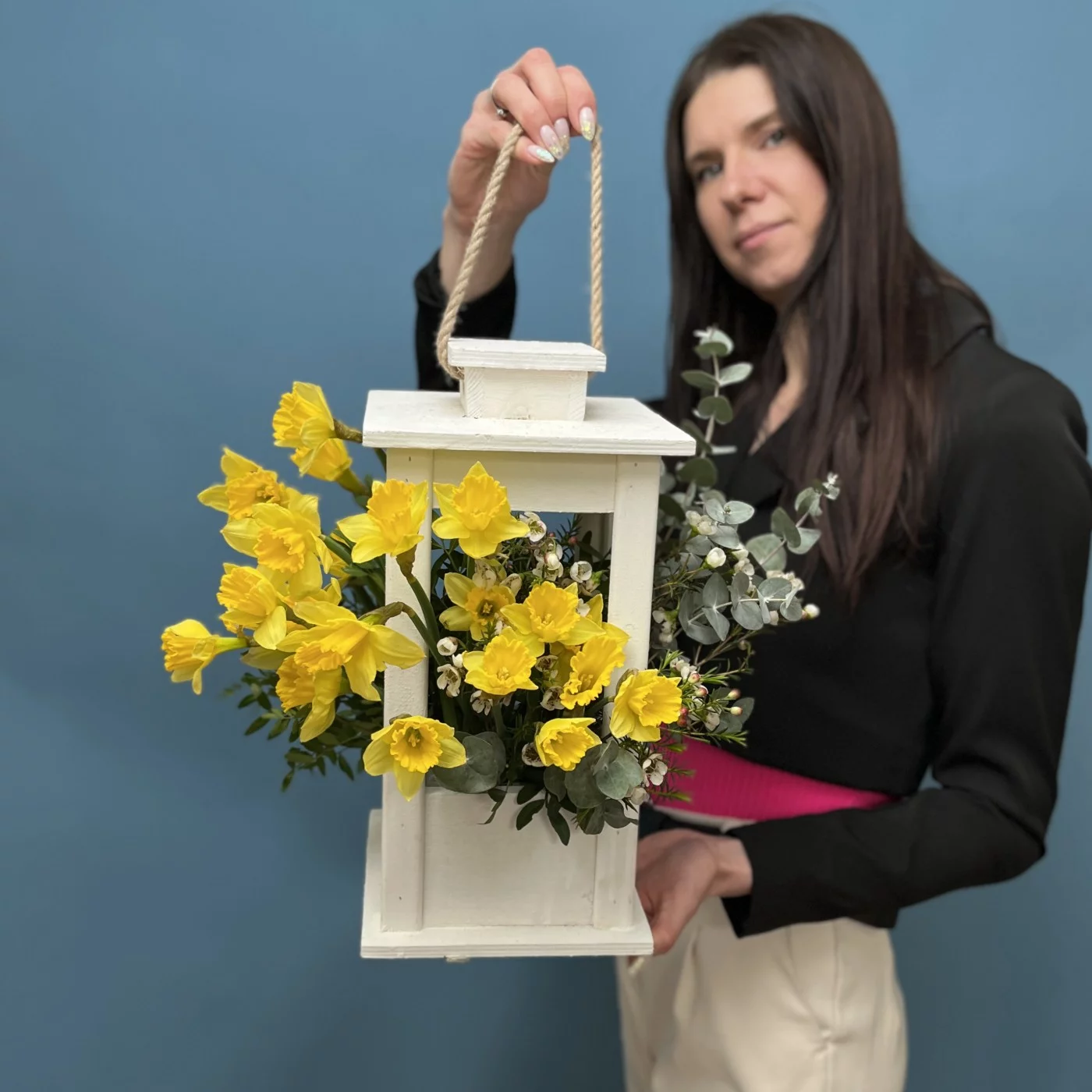 Весенняя композиция в фонаре с нарциссами — это оригинальное и стильное цветочное оформление, которое добавит яркие акценты и весеннее настроение в любой интерьер.