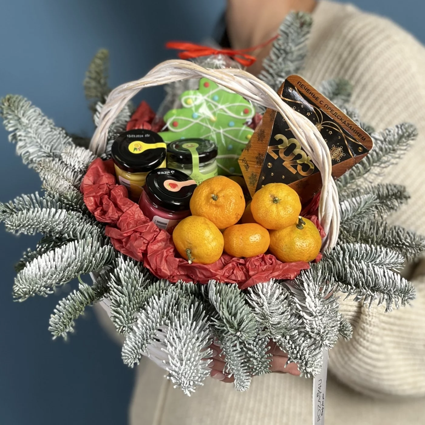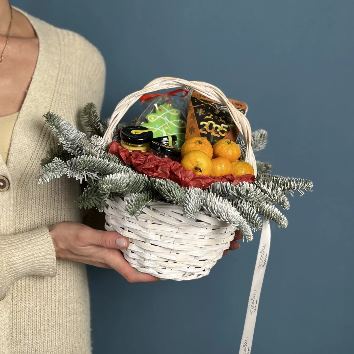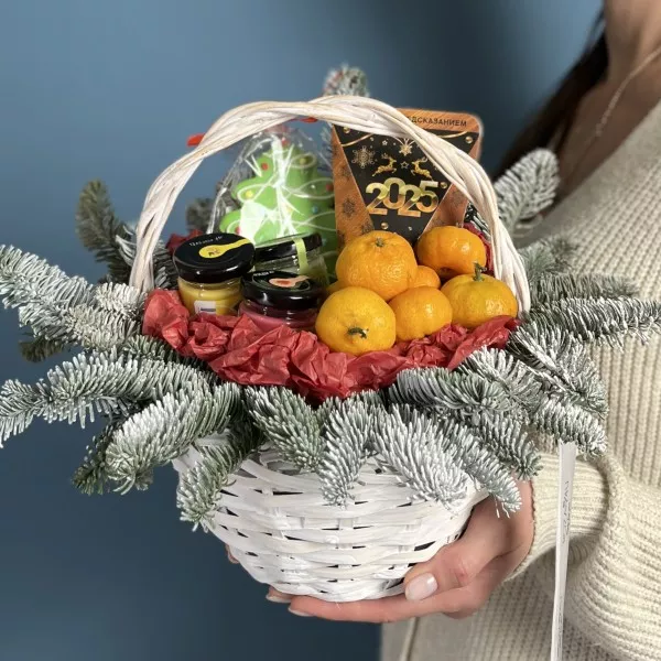 Такая композиция будет актуально в подарок коллегам или как знак внимания в новогодние праздники.