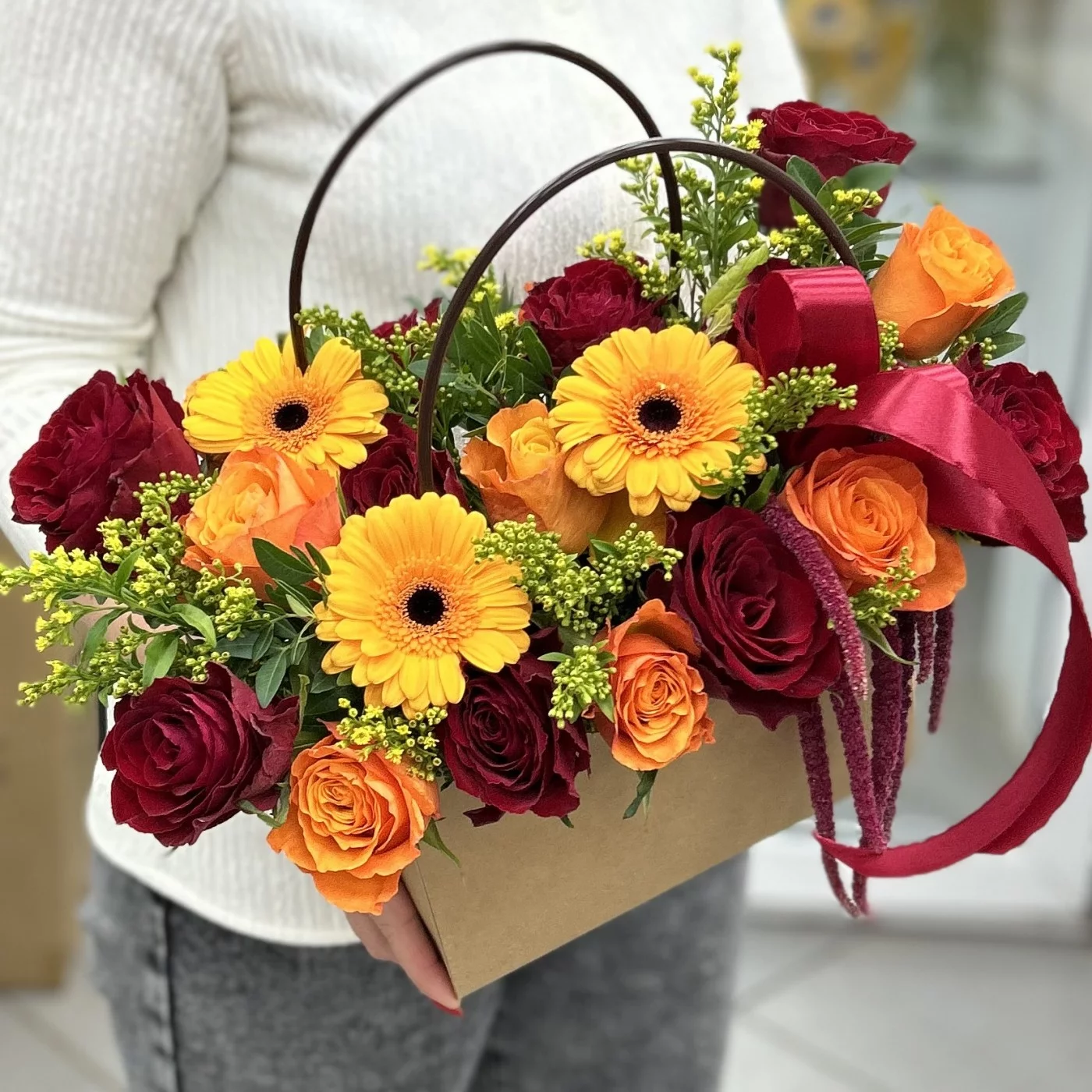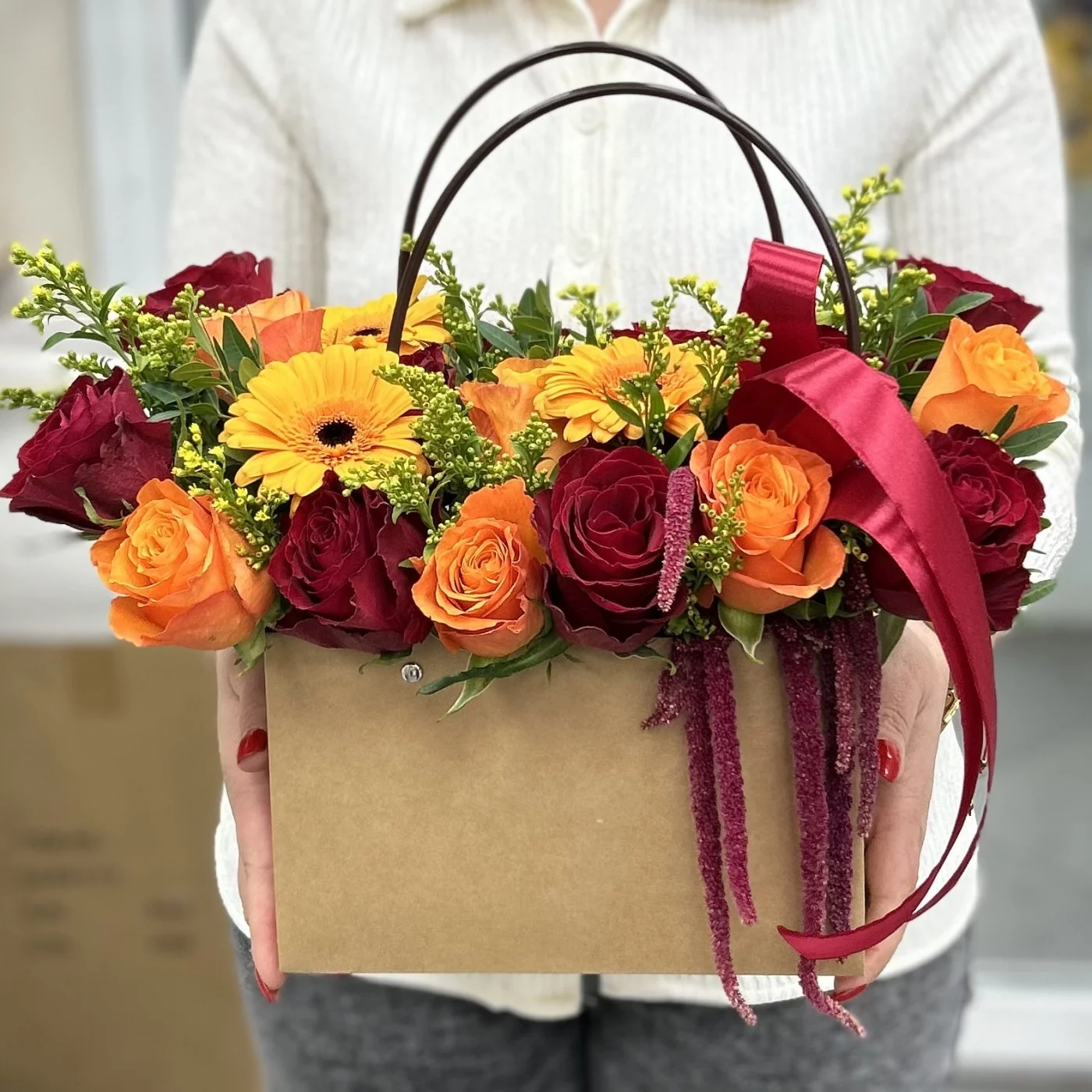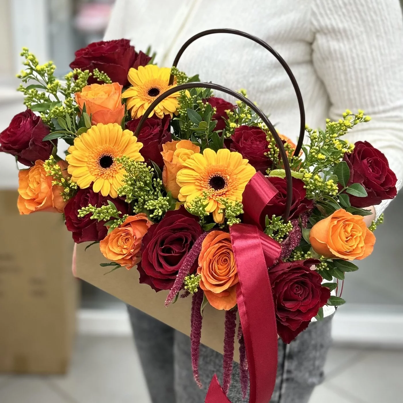 Яркая композиция с герберами и розами в сумочке наполнит пространство радостью, теплом и яркими эмоциями, создавая атмосферу праздника и вдохновения.