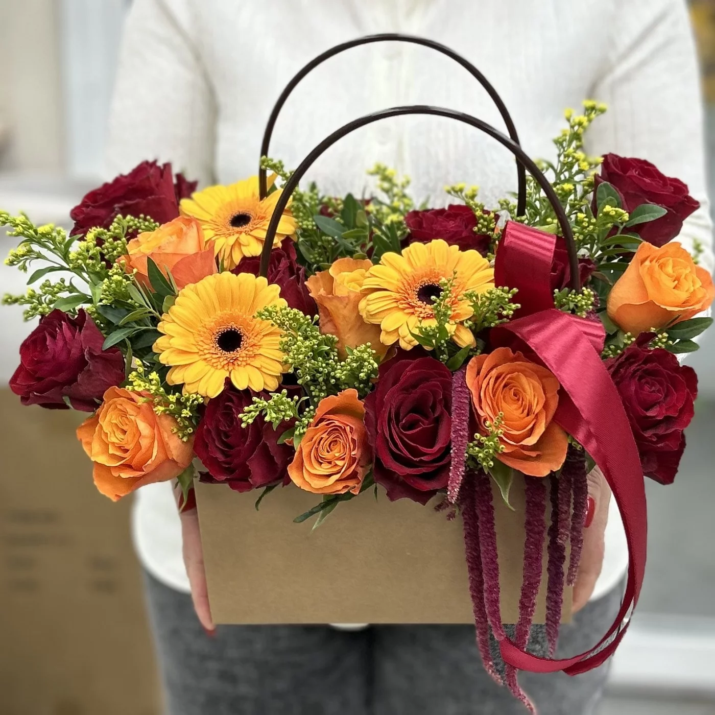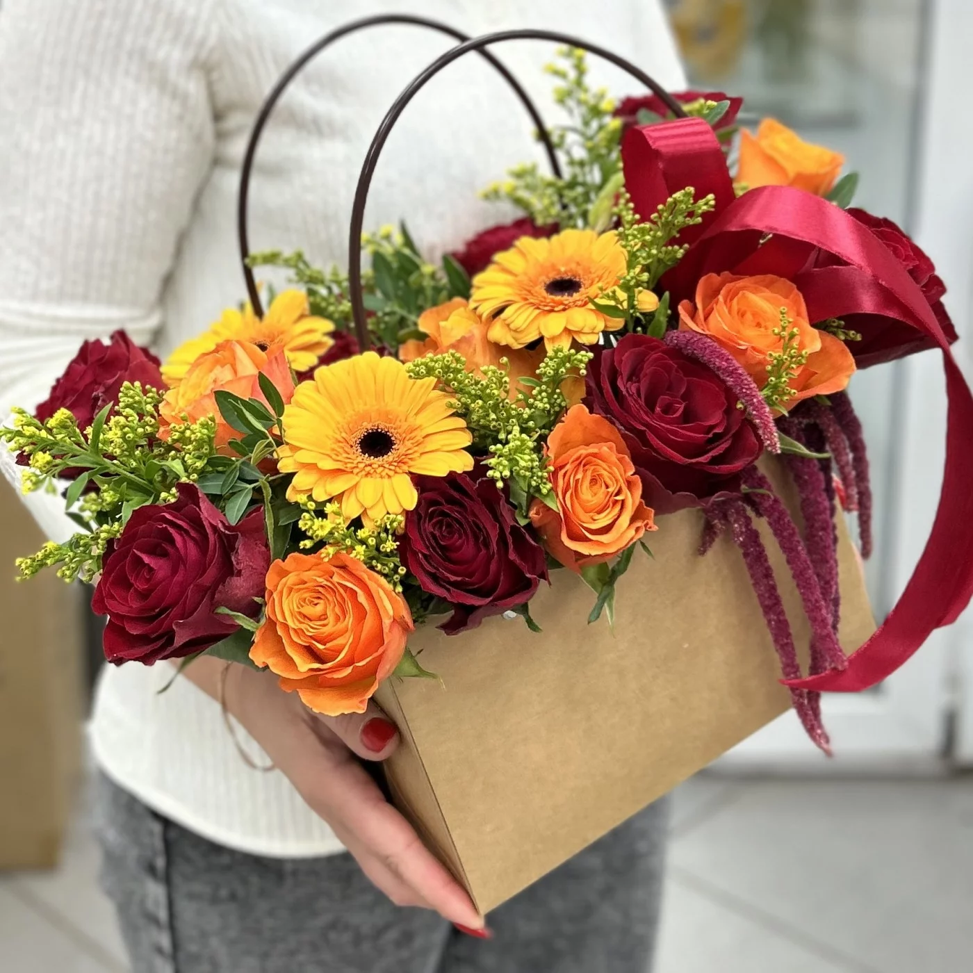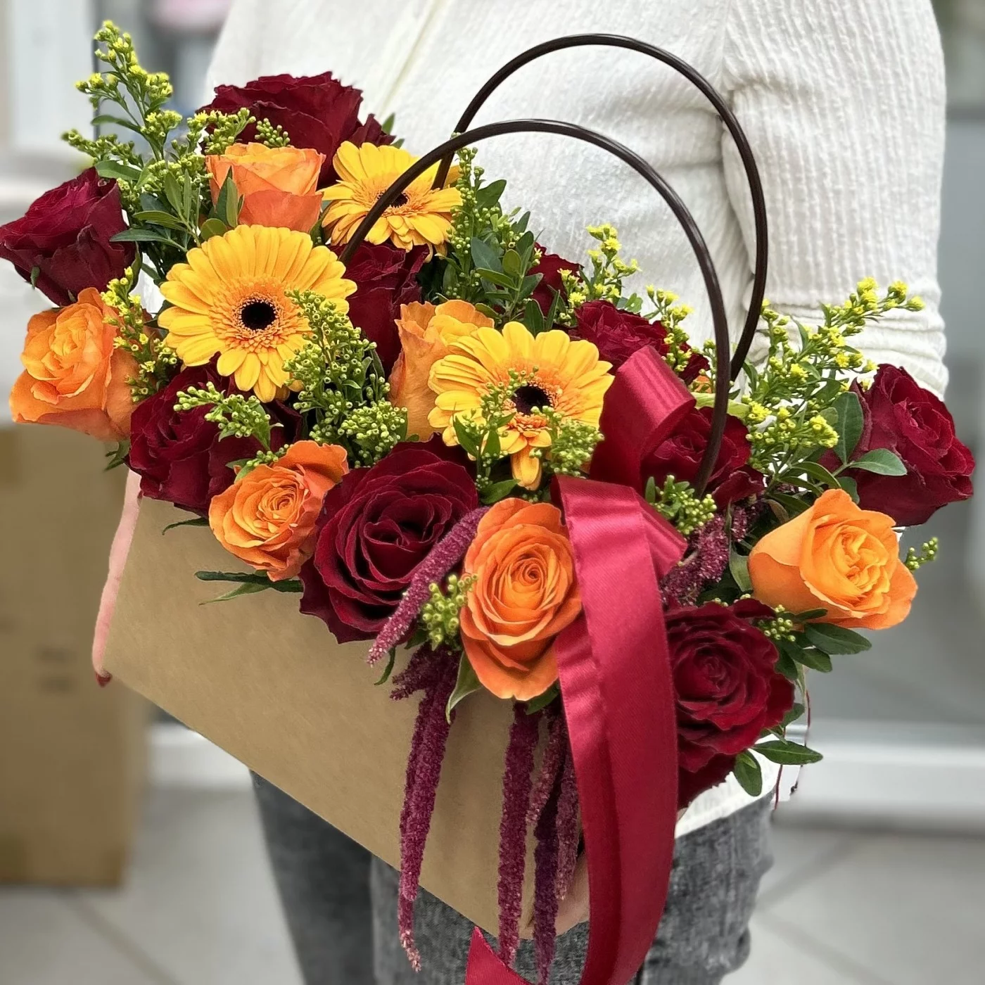 Яркая композиция с герберами и розами в сумочке наполнит пространство радостью, теплом и яркими эмоциями, создавая атмосферу праздника и вдохновения.