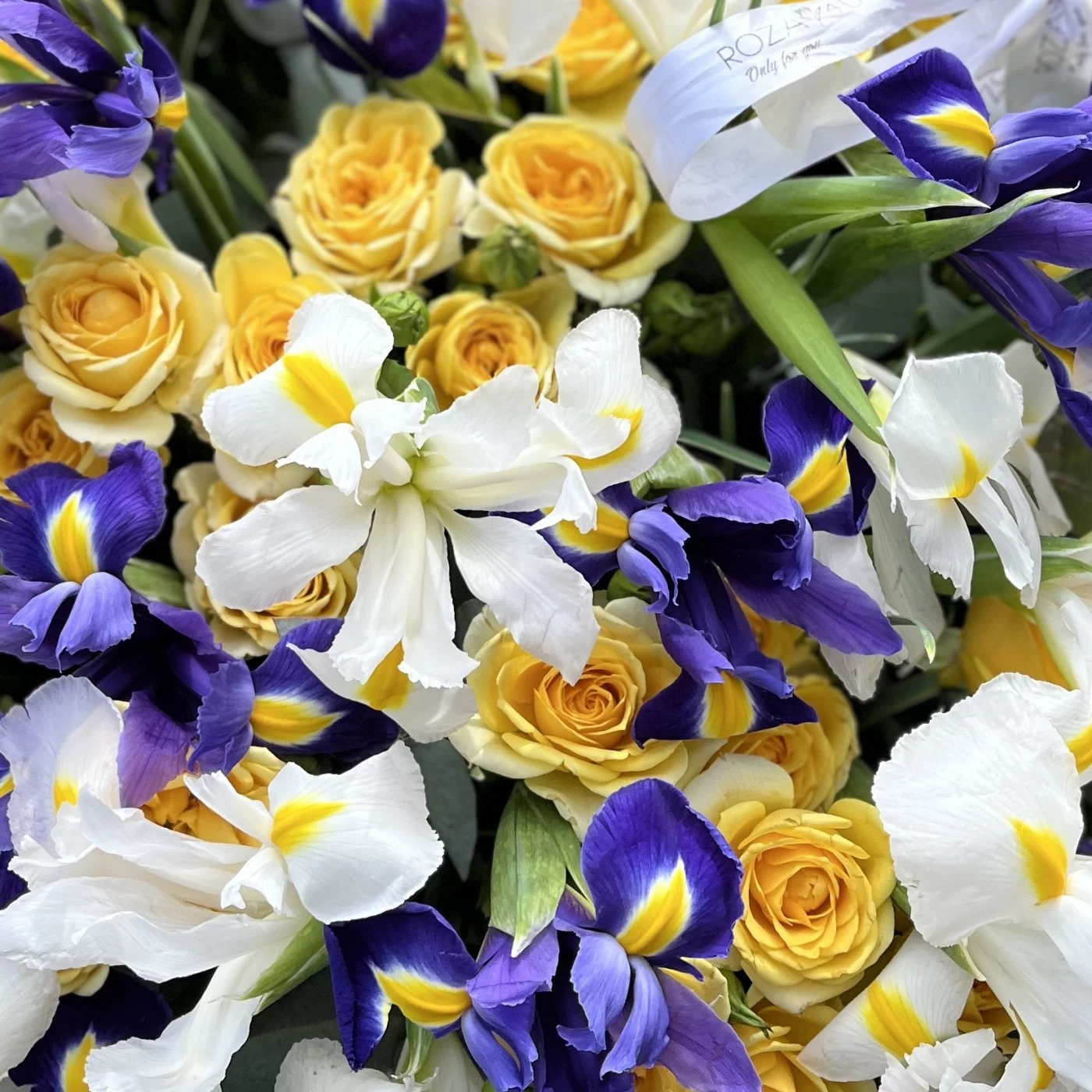 В ней собраны изысканные ирисы и кустовые розы, создающие гармоничную композицию с насыщенными цветами и утонченным стилем.