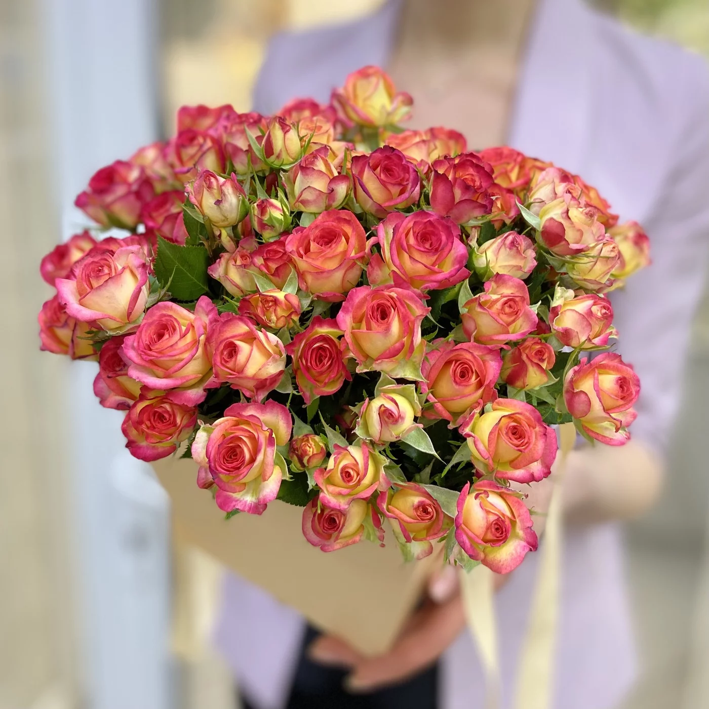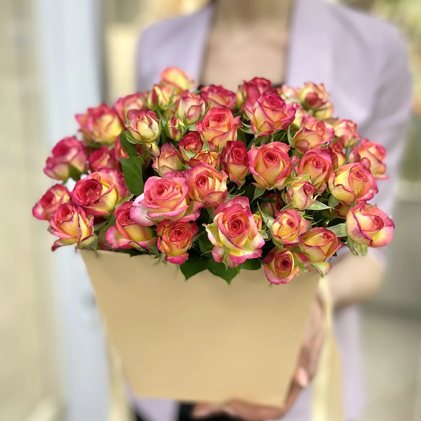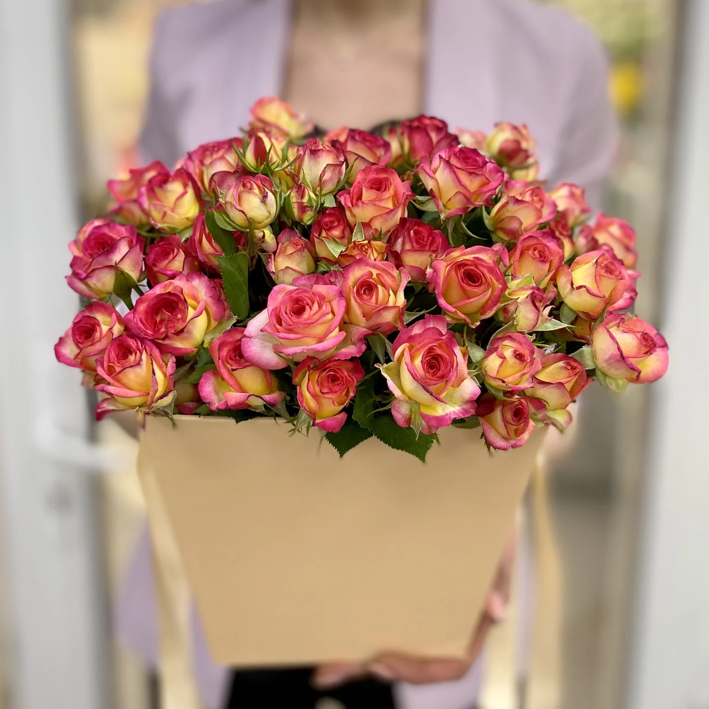Яркие кустовые розы в коробке