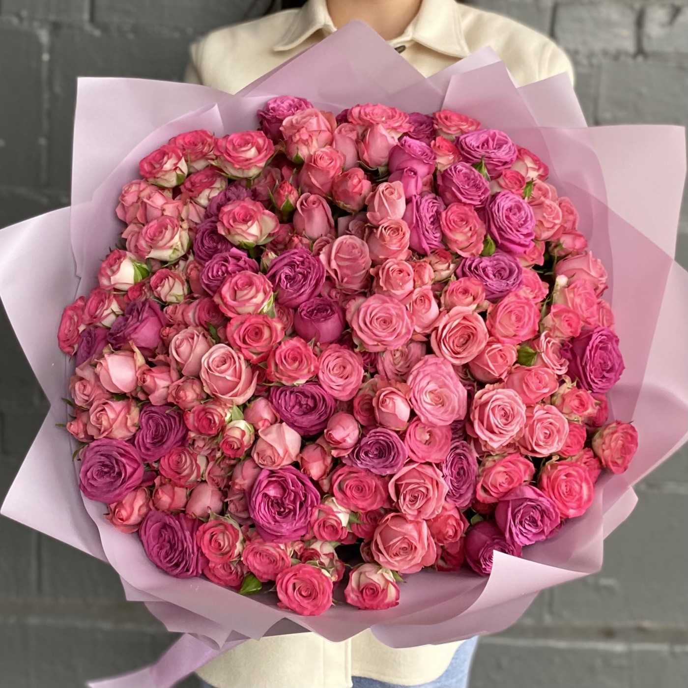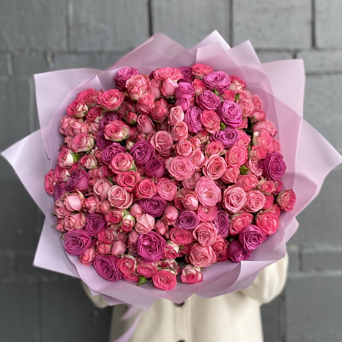 Букет из трех сортов кустовых роз. Пионовидная роза Дионн, Хали и Классик Сенсейшен. Это очень красивое сочетание станет прекрасным сюрпризом для вашей любимой или мамы. Этот букет можно подарить с поводом и без, просто порадовать красивый бует в качестве благодарности или для хорошего настроения.