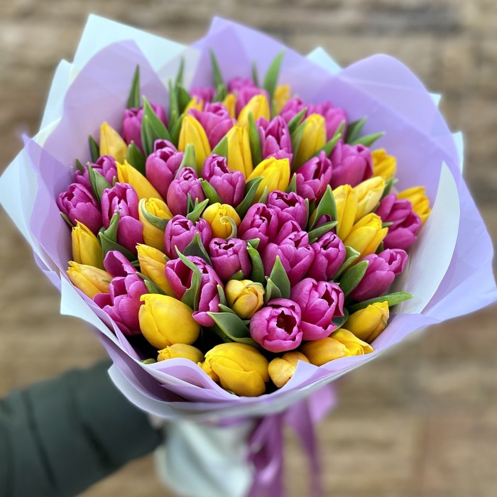 Яркий, жизнерадостный, весенний букет из розовых и желтых тюльпанов создан очаровывать с первого взгляда. Букет свежих ароматных цветов - идеальный подарок к 8 марта.