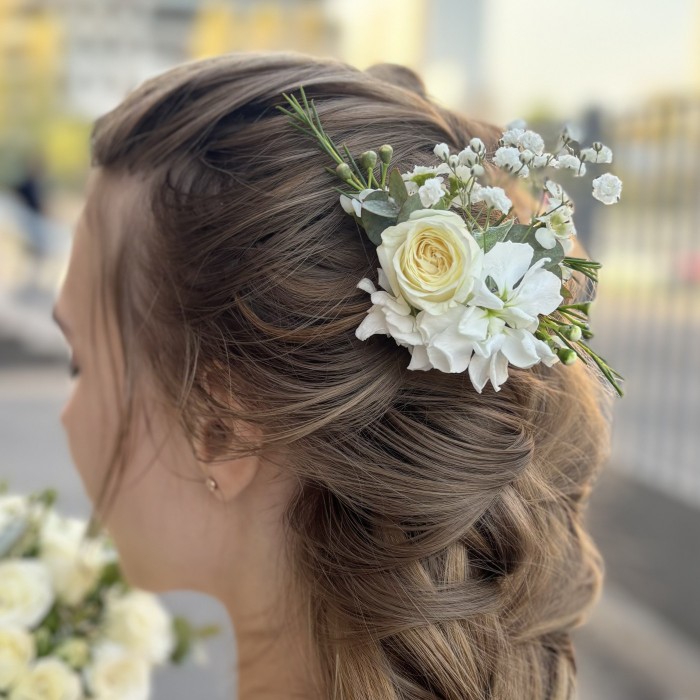Заколка в волосы с кустовой белой розой и гипсофилой – это прекрасный и романтичный аксессуар, который отлично подойдет для свадебного торжества, особенно для невесты и подружек невесты.