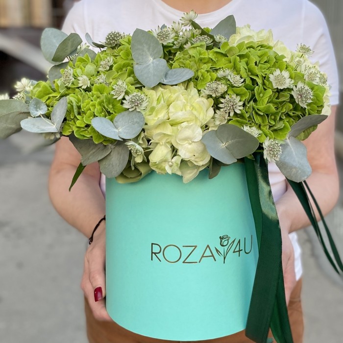 Cвежий и оригинальный букет, в котором сочетаются разнообразные оттенки зеленых гортензий с нежными листьями эвкалипта. Оформленная в стильной коробке, эта композиция станет прекрасным украшением для любого интерьера или оригинальным подарком.
