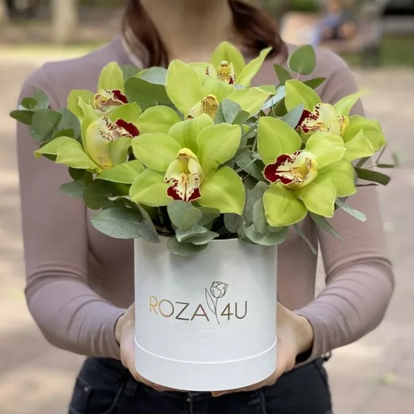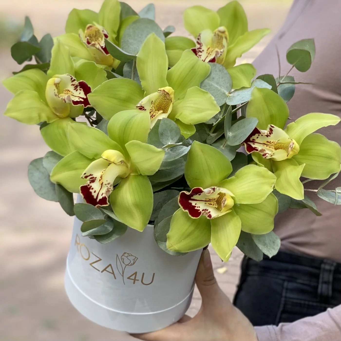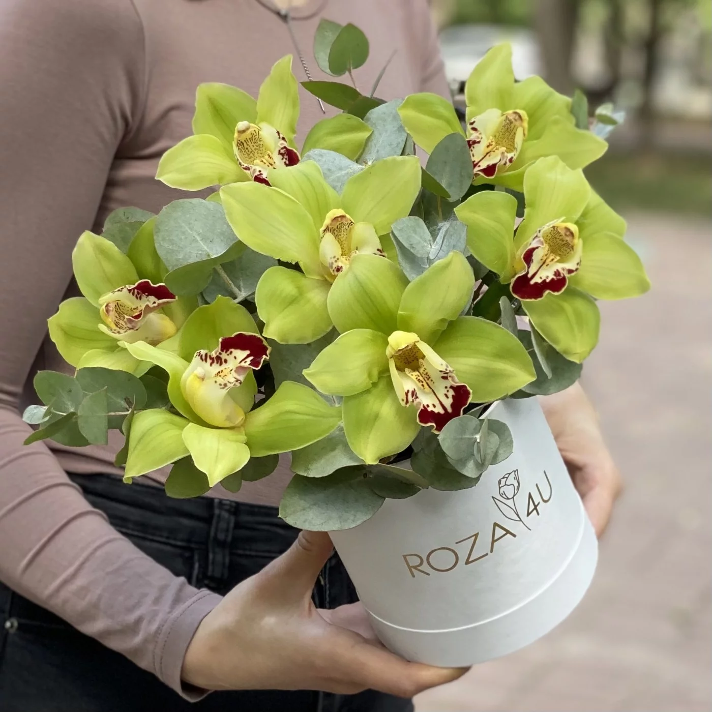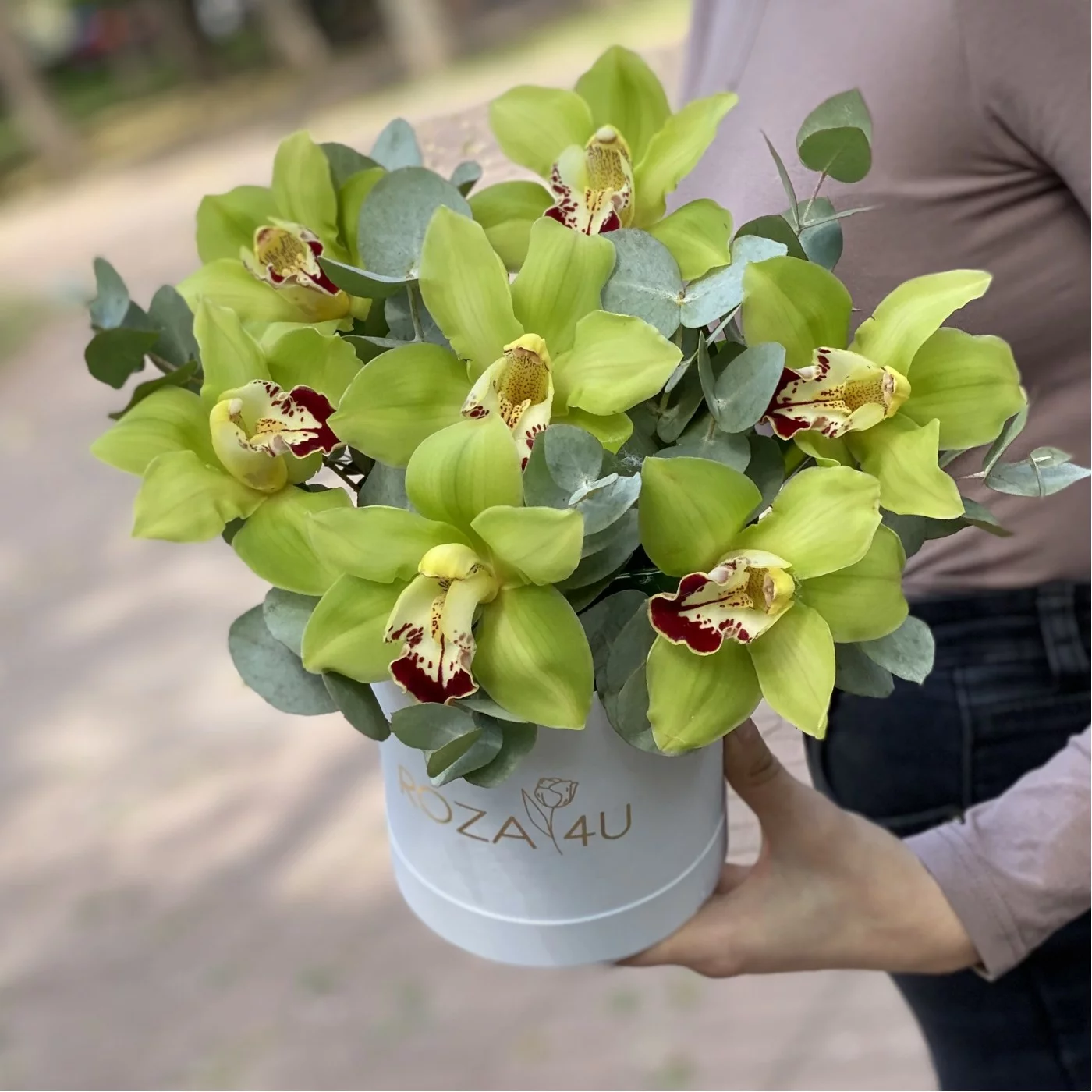 Состав букета: орхидея – 7 шт, эвкалипт и шляпная коробка.