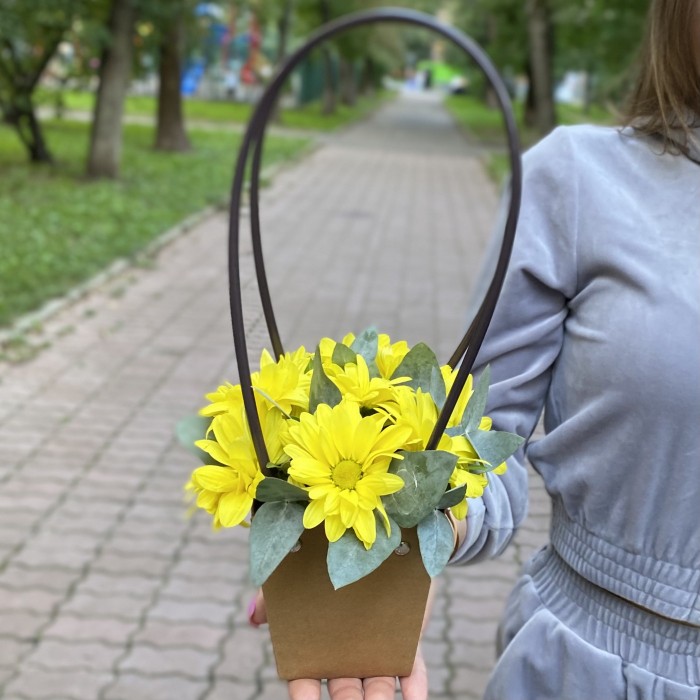 Композиция из кустовой желтой хризантемы Бакарди с ароматным эвкалиптом в стильном пакете сумочке. Такую композицию можно подарить первоклашке на 1 сентября или преподнести педагогу. Доставляем букеты и композиции по Москве и Подмосковью круглосуточно!