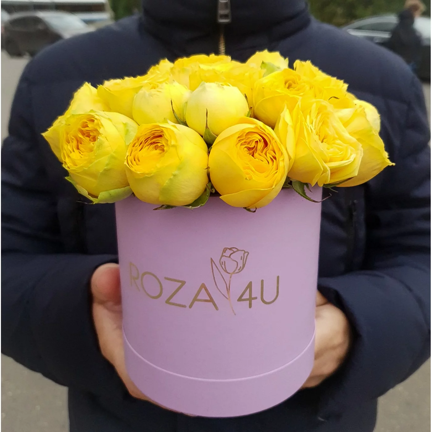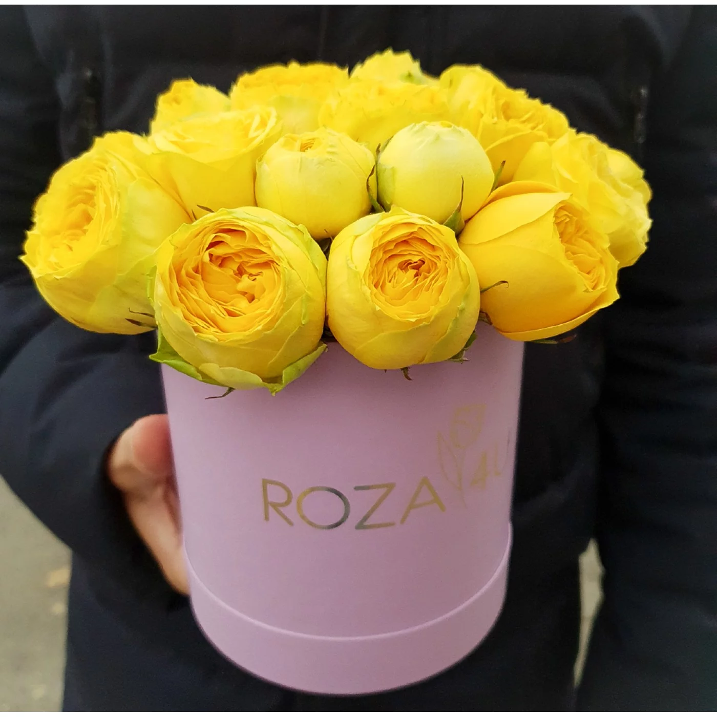 Желтые пионовидные розы в коробке