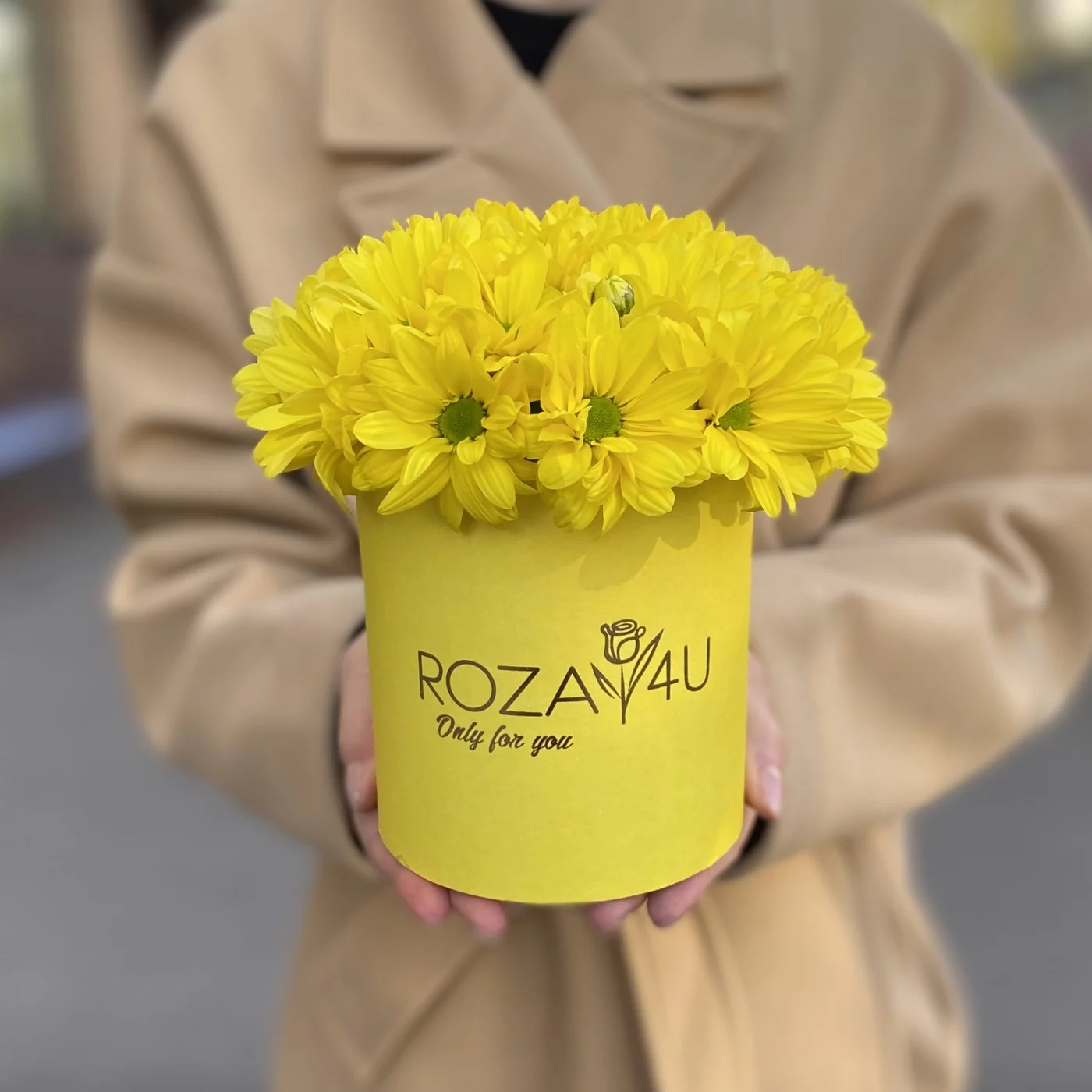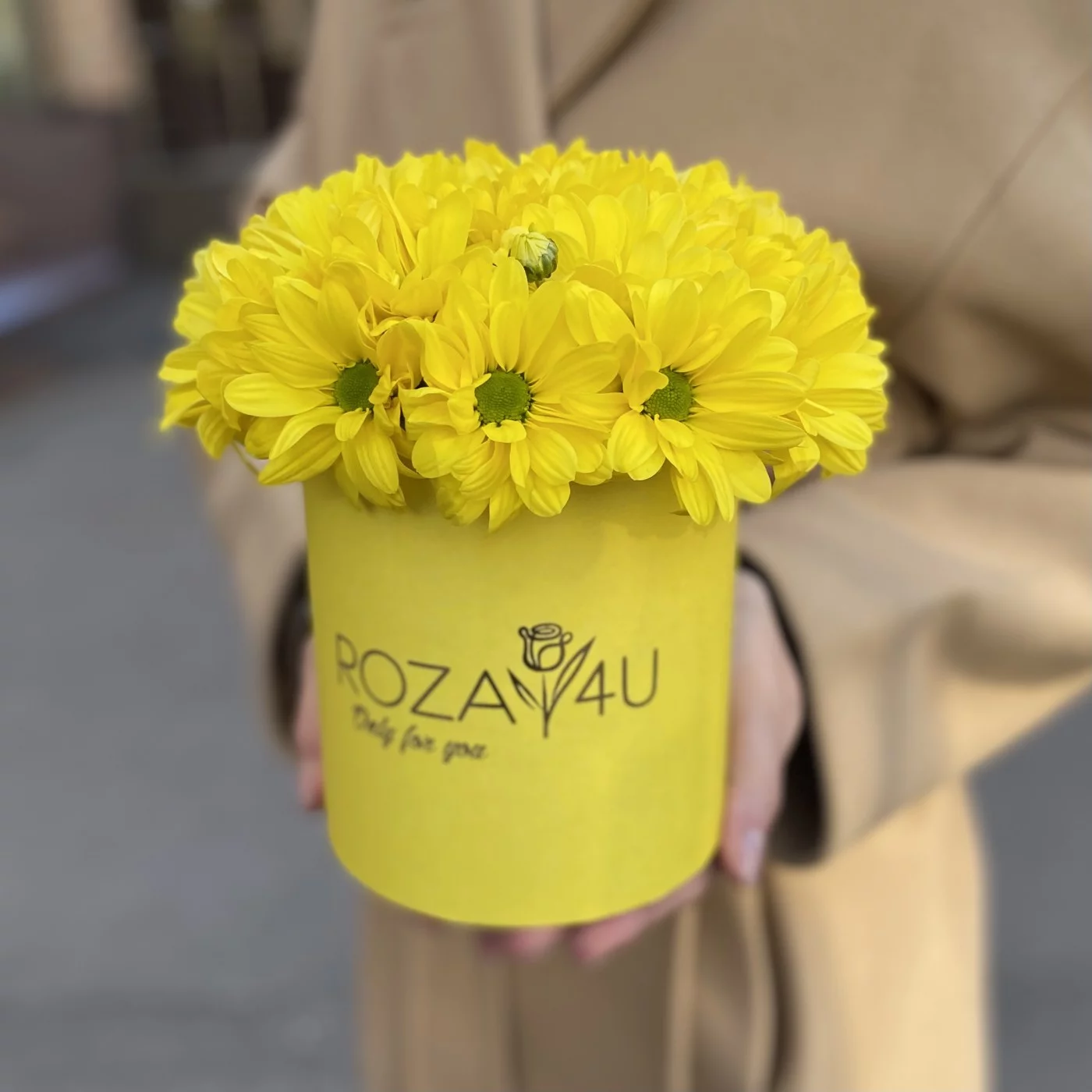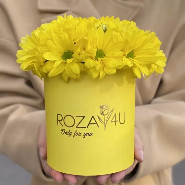 Очаровательная композиция из хризантем в шляпной коробке - отличный комплимент для близкого человека. Свежие ароматные цветы станут приятным сюрпризом и подарят прекрасное настроение. Благодаря низкой стоимости, композиция пользуется особой популярностью у наших клиентов. Хризантемы в шляпной коробке - универсальный подарок, очаровательной композиции будет рада любая девушка.