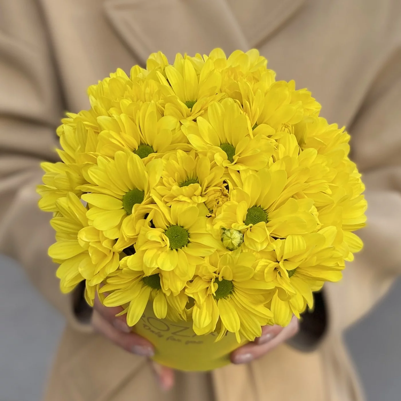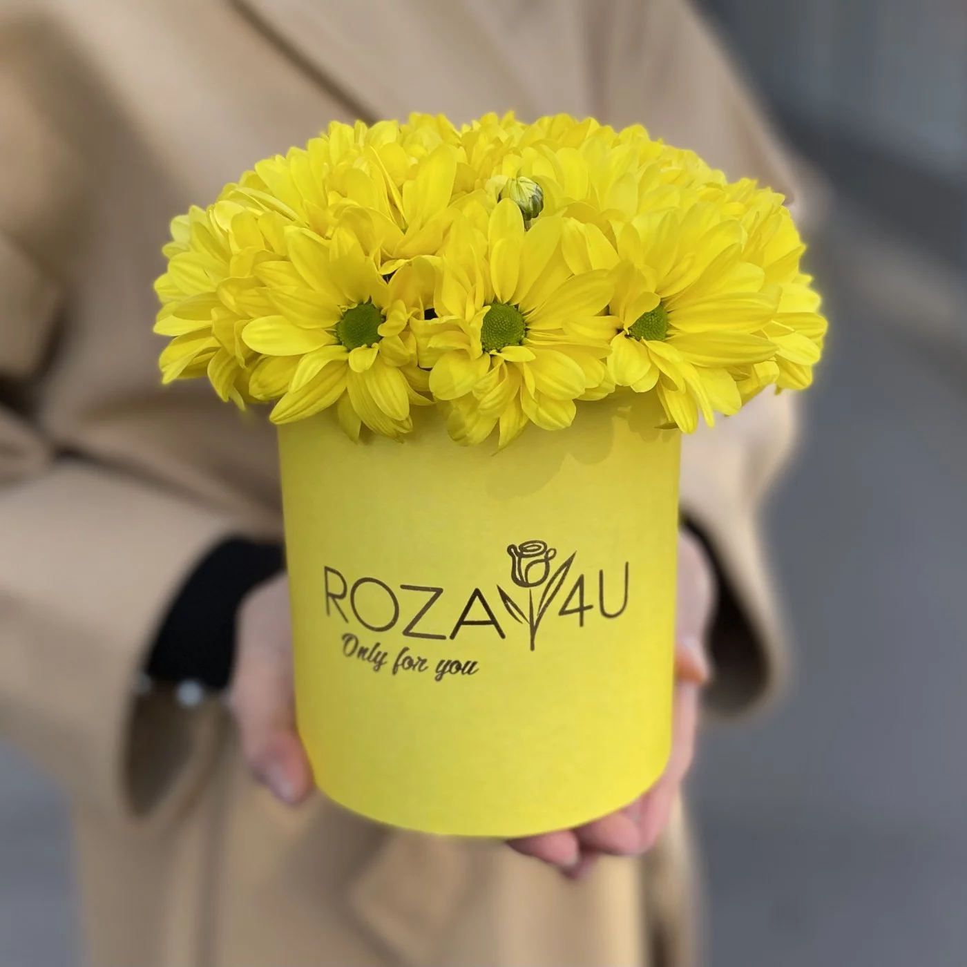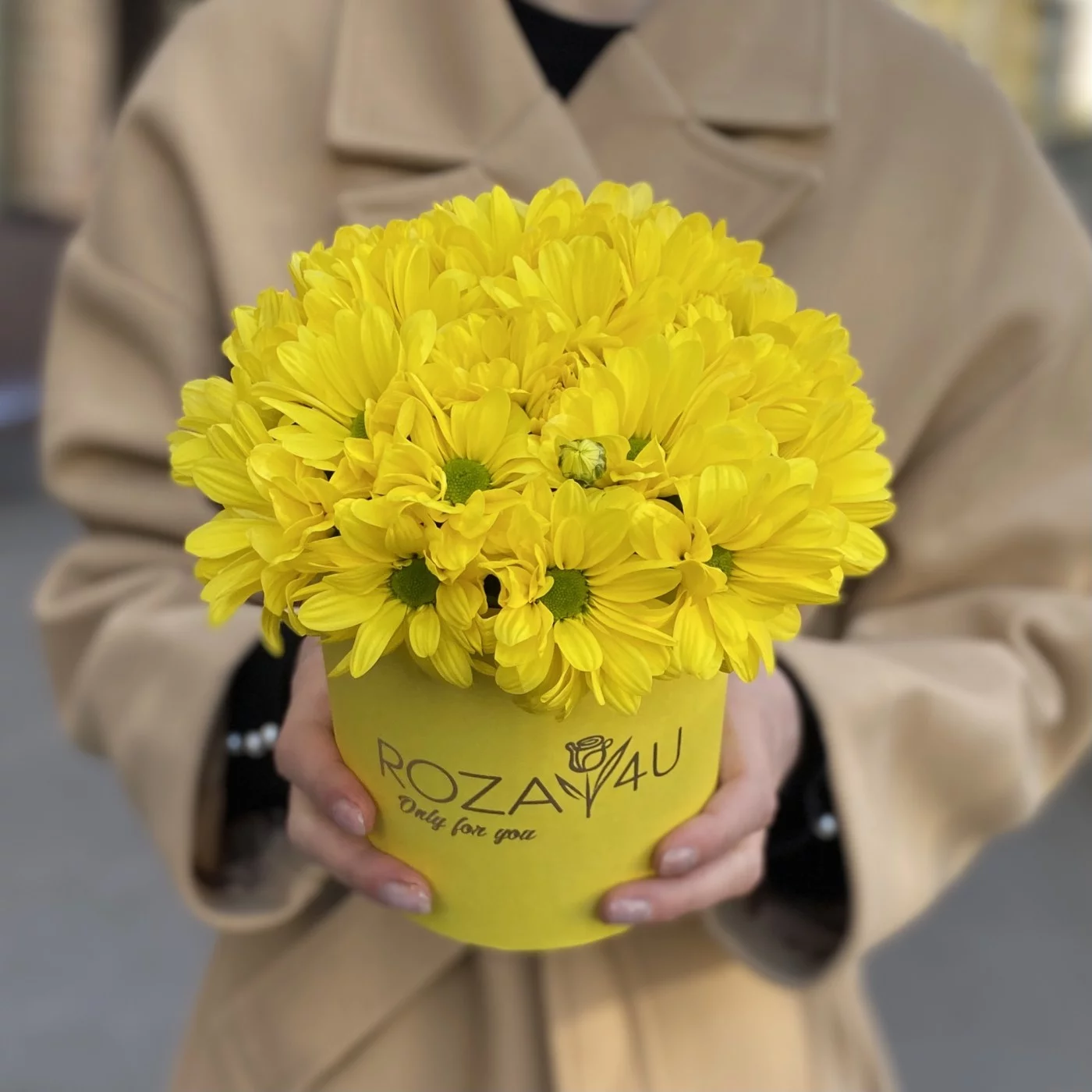 Очаровательная композиция из хризантем в шляпной коробке - отличный комплимент для близкого человека. Свежие ароматные цветы станут приятным сюрпризом и подарят прекрасное настроение. Благодаря низкой стоимости, композиция пользуется особой популярностью у наших клиентов. Хризантемы в шляпной коробке - универсальный подарок, очаровательной композиции будет рада любая девушка.