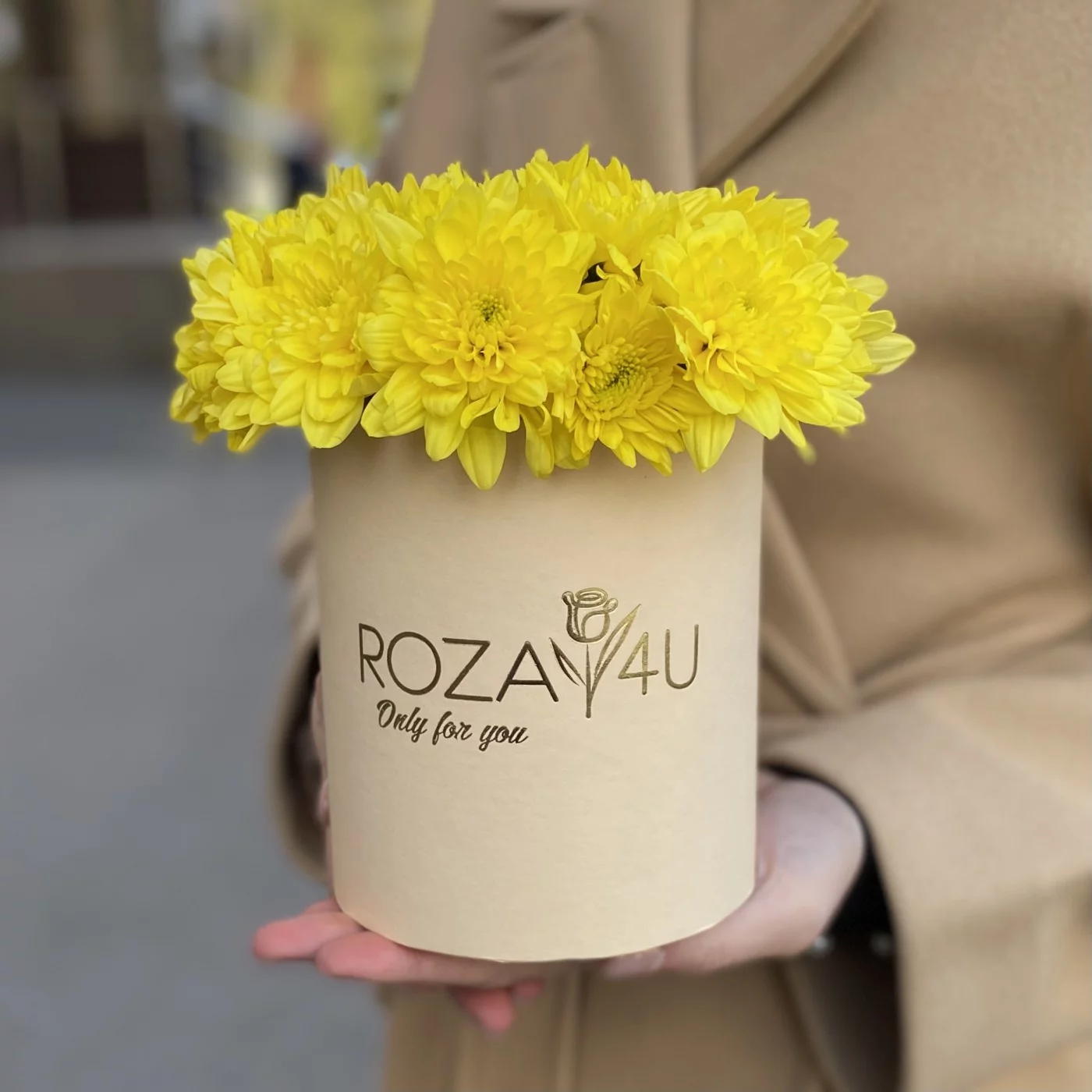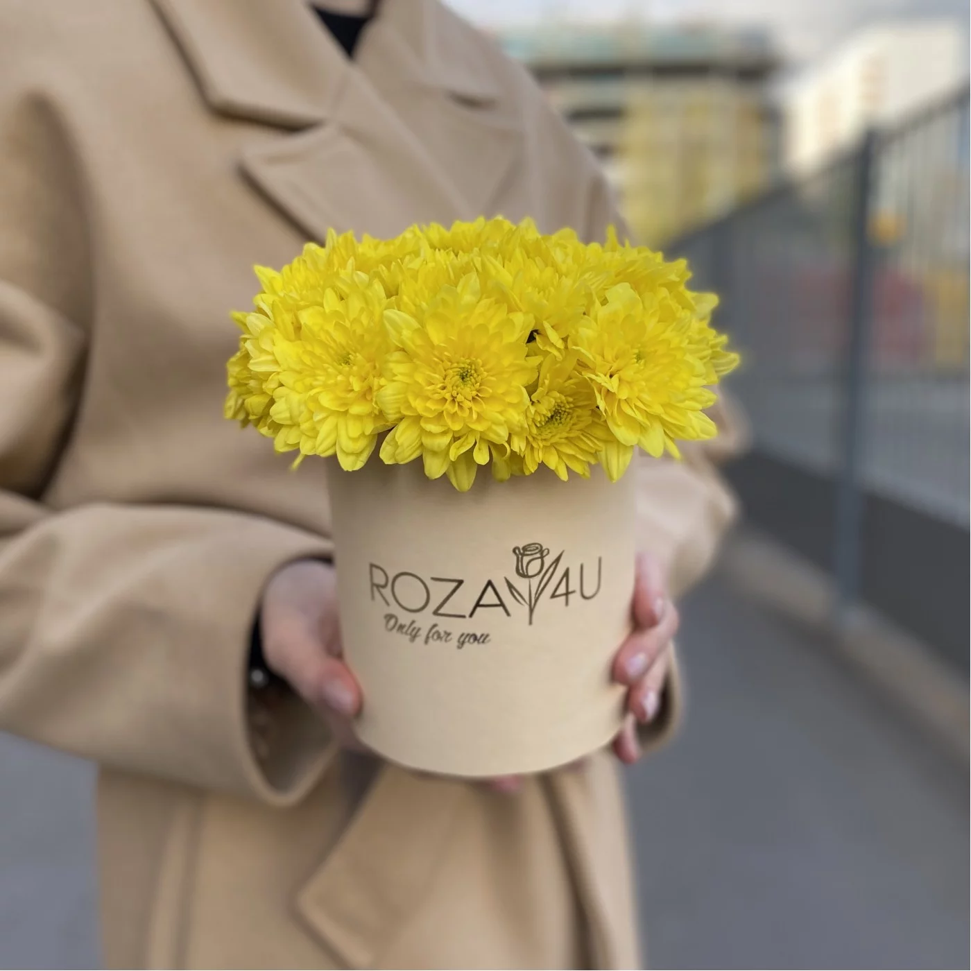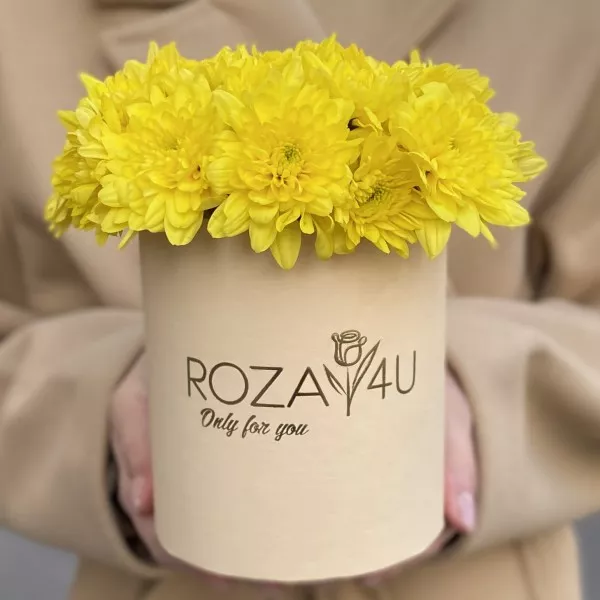 Очаровательная композиция из хризантем в шляпной коробке - отличный комплимент для близкого человека. Свежие ароматные цветы станут приятным сюрпризом и подарят прекрасное настроение. Благодаря низкой стоимости, композиция пользуется особой популярностью у наших клиентов. Хризантемы в шляпной коробке - универсальный подарок, очаровательной композиции будет рада любая девушка.