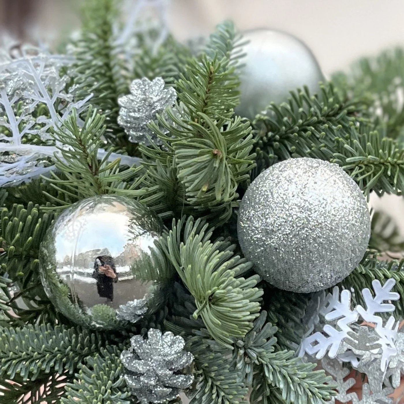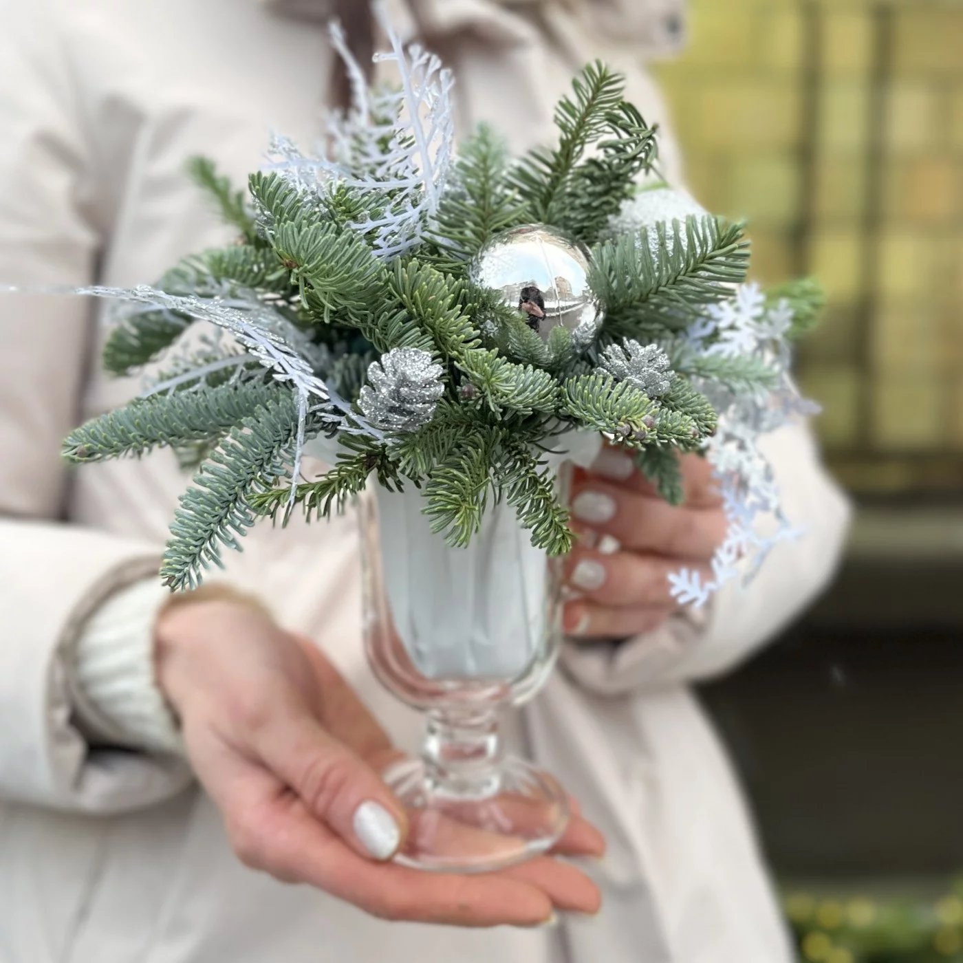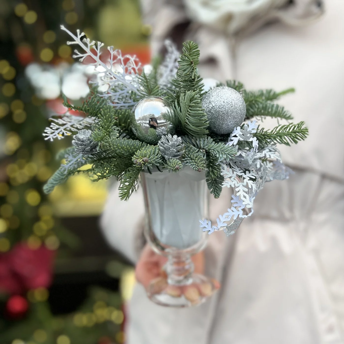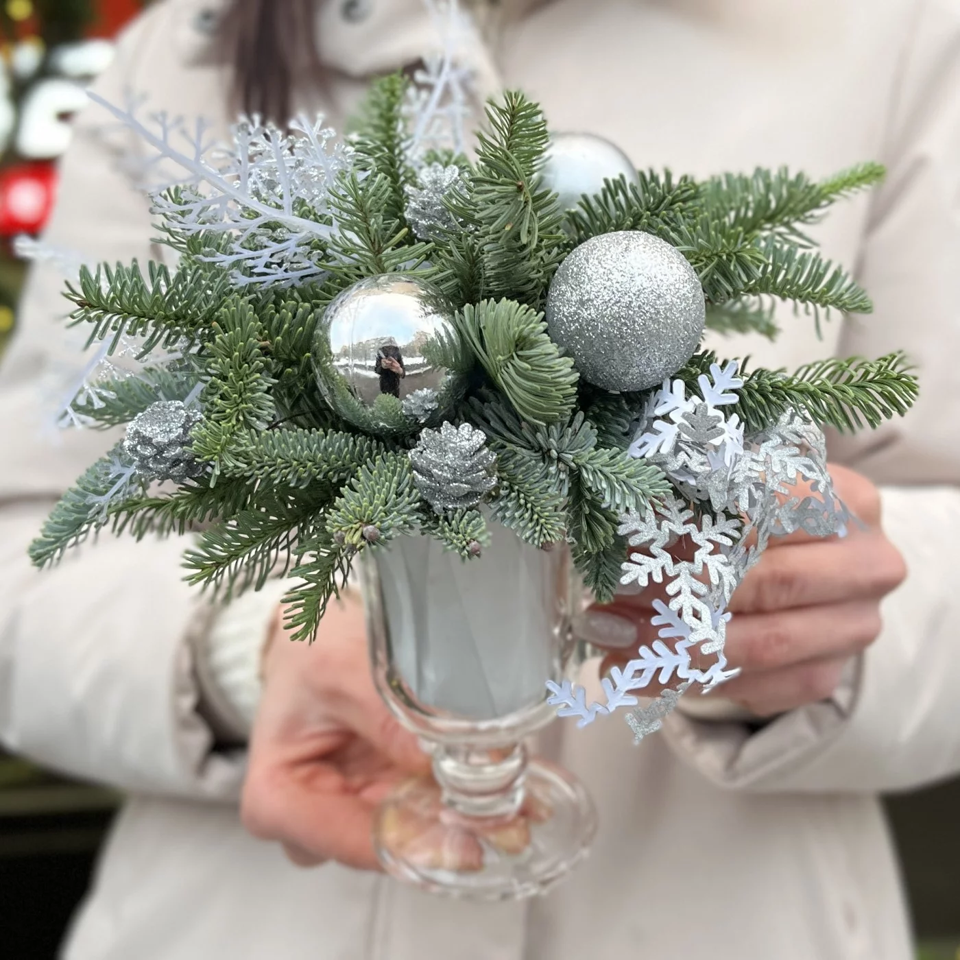 Зимняя настольная композиция серебряного цвета — это изысканное и современное решение для создания элегантной атмосферы в вашем доме в холодное время года. Серебряная палитра ассоциируется с морозным блеском и зимним волшебством, что делает такую композицию идеальной для праздничных мероприятий или просто для украшения интерьера.